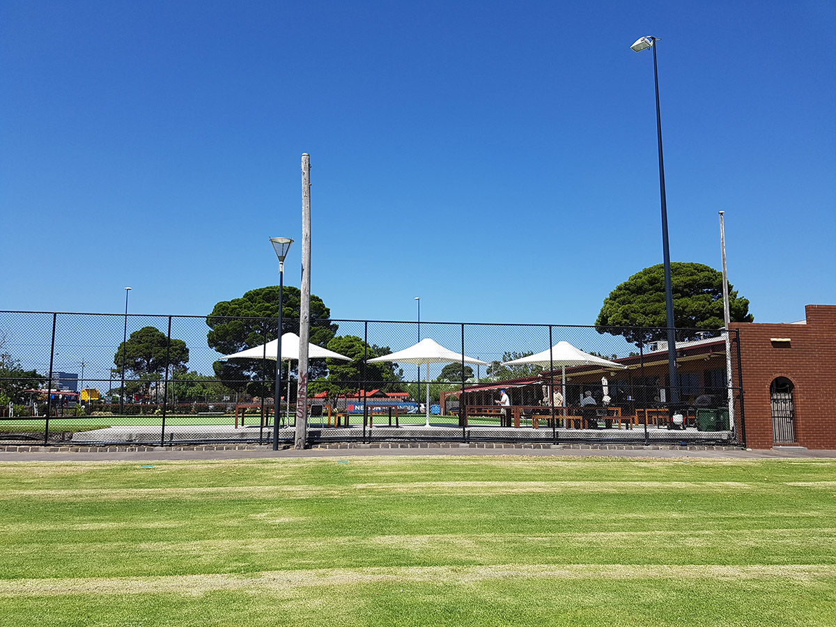 The FlemKen Bowling Club came to us with a major pain point in that their patrons could not comfortably watch and enjoy a cold drink outside due to the lack of shade on their Western border. They had recently installed some makeshift shade solutions but all had failed in the windy exposed area.
