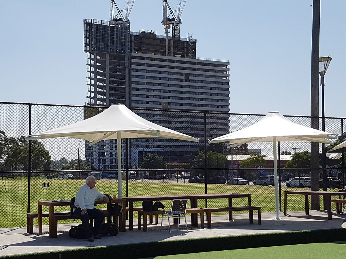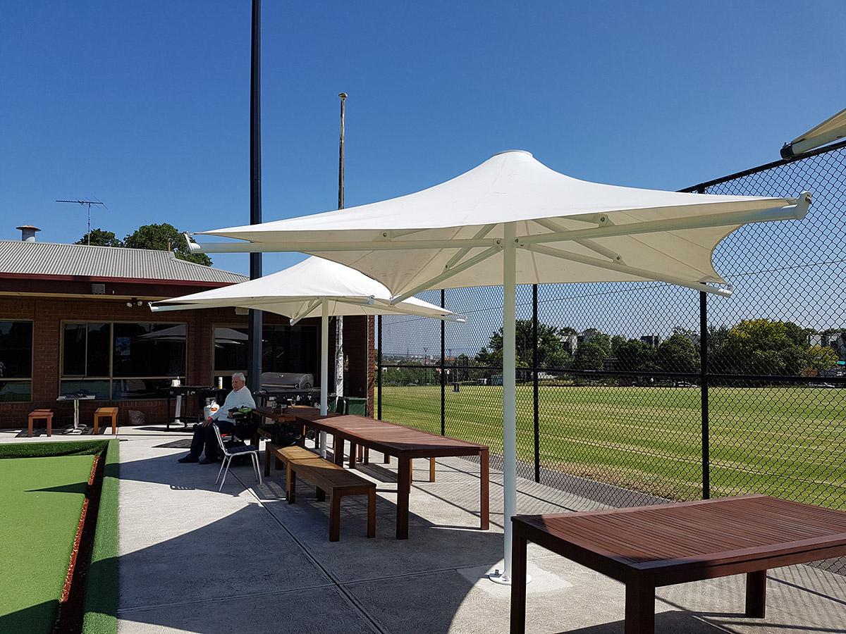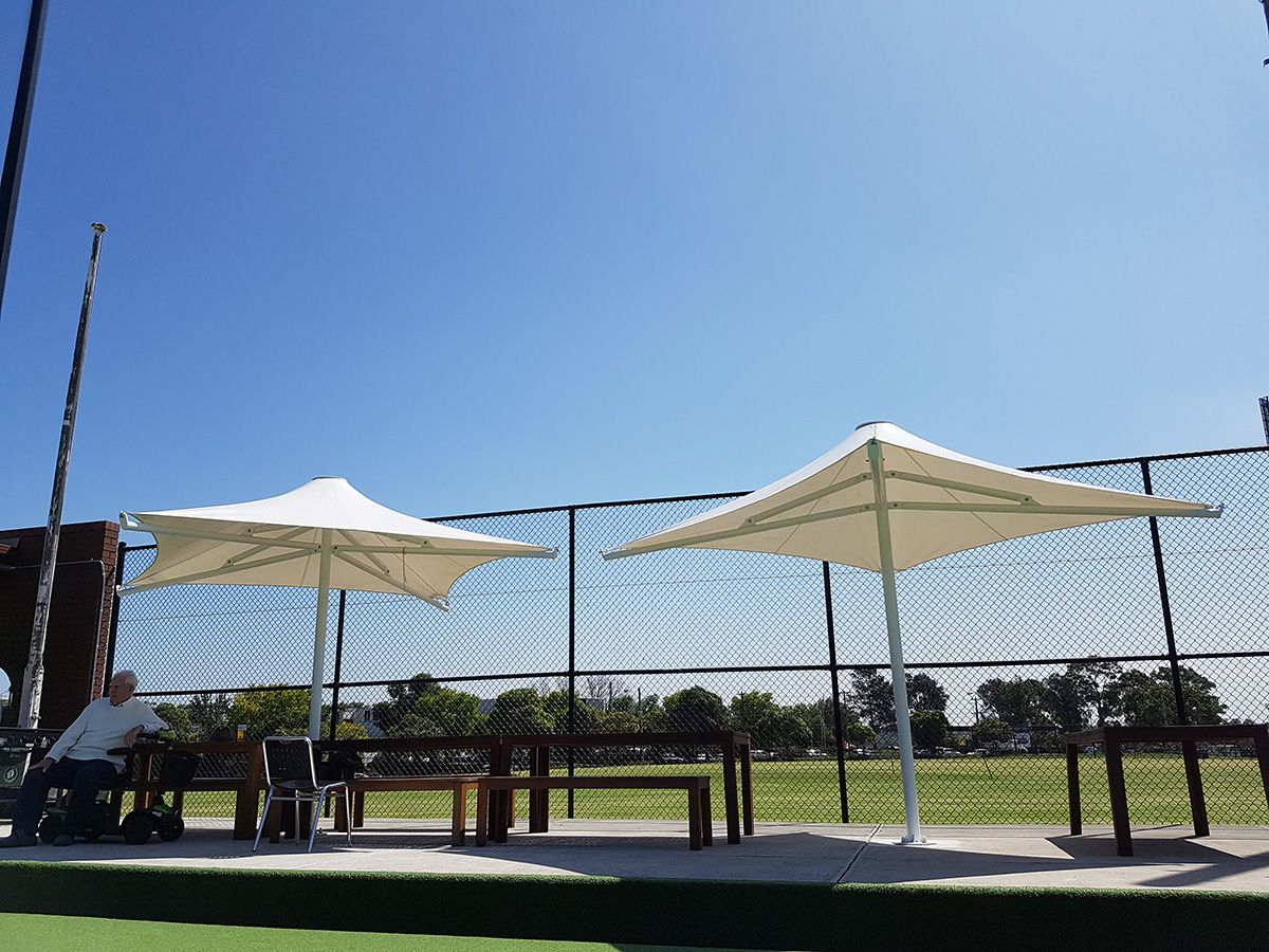 The bowling club ordered three umbrellas 3.2m x 3.2m square with a clearance height of 2.2m. The PVC canopies were Polyplan 680, a highly suitable PVC for this scenario. The umbrellas are fixed and highly durable in hazardous weather conditions. Custom footings were concreted in to ensure the umbrellas would be sustainable and the bowling club would be able to maximise use of the outdoor area.