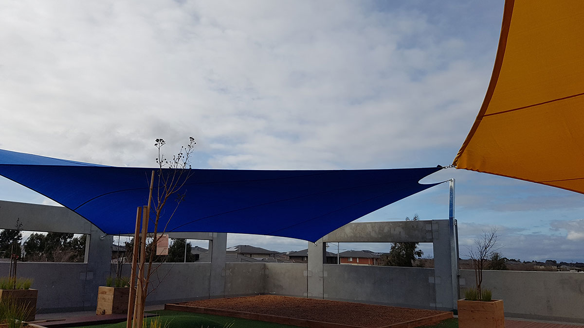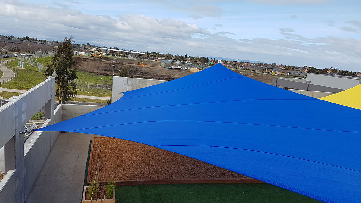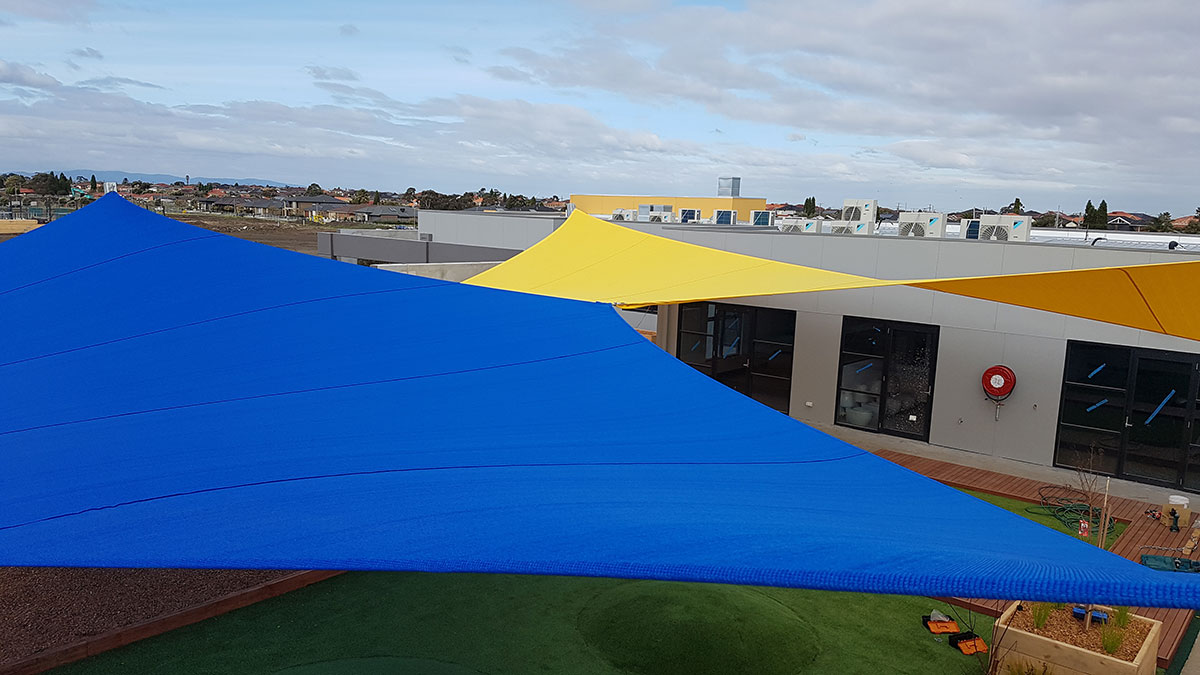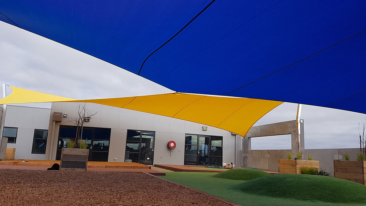 Strong and ideal for larger commercial jobs, our premium high-grade Comshade shadecloth was the preferred material for the sails. Colours of yellow and aquamarine were chosen to add a bright and welcoming feel to the early educational setting. Five sails were required in total, all of which were installed at high-tension to add shape, resist adverse weather conditions and increase durability.