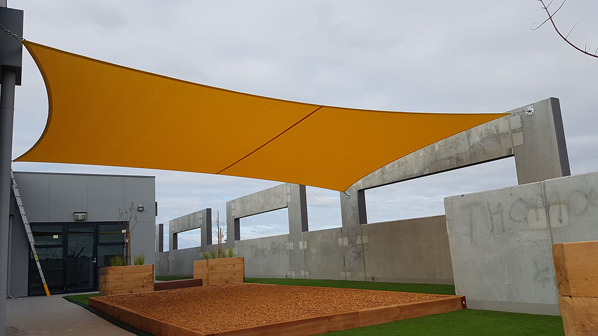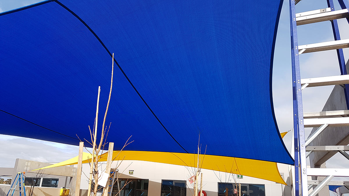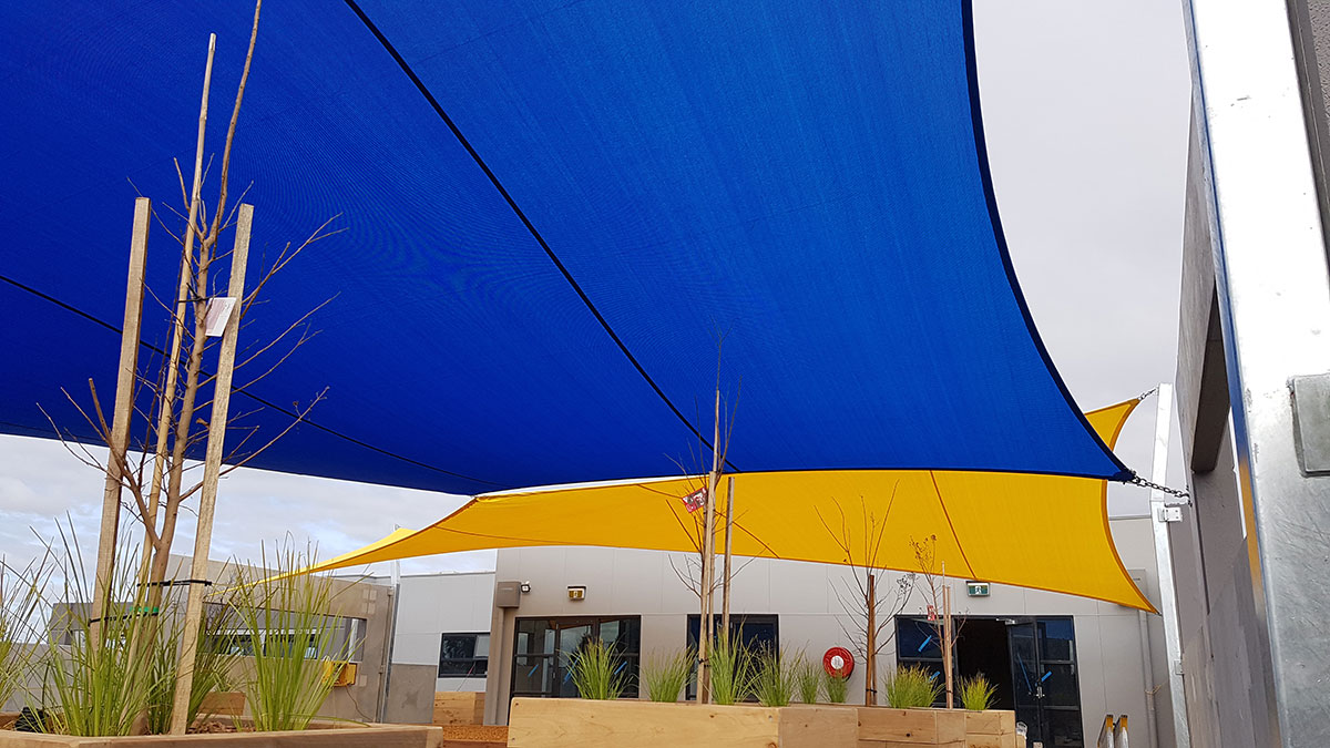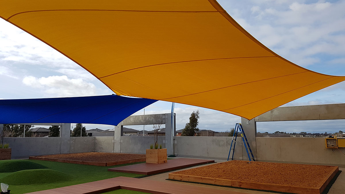 Strong and ideal for larger commercial jobs, our premium high-grade Comshade shadecloth was the preferred material for the sails. Colours of yellow and aquamarine were chosen to add a bright and welcoming feel to the early educational setting. Five sails were required in total, all of which were installed at high-tension to add shape, resist adverse weather conditions and increase durability.