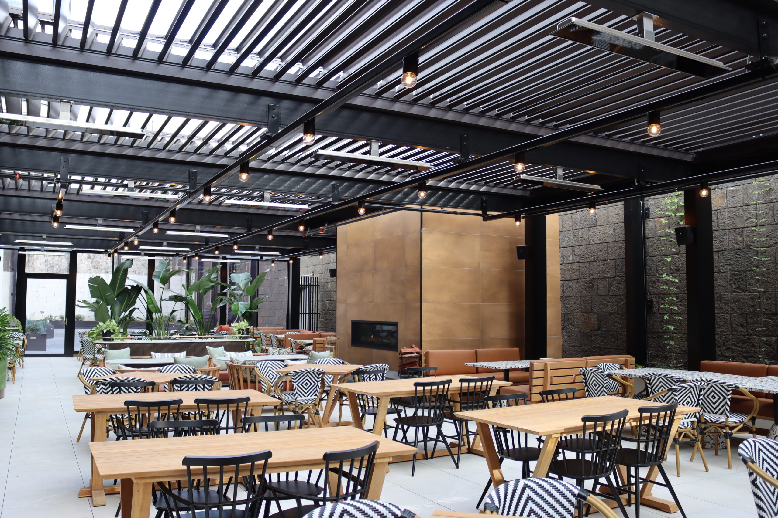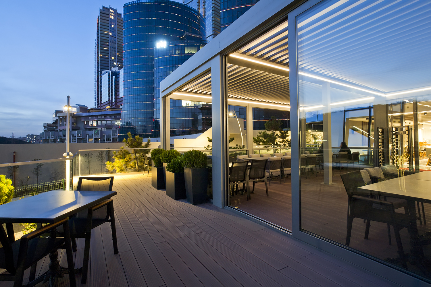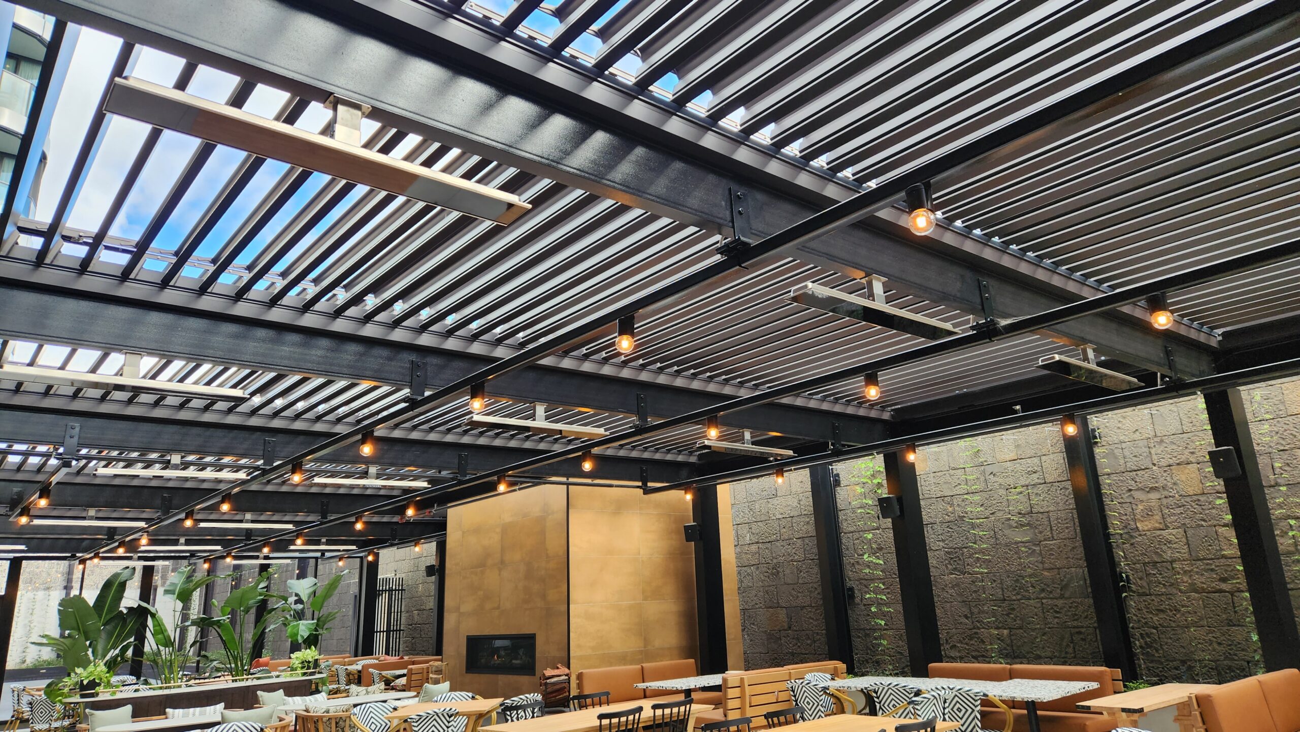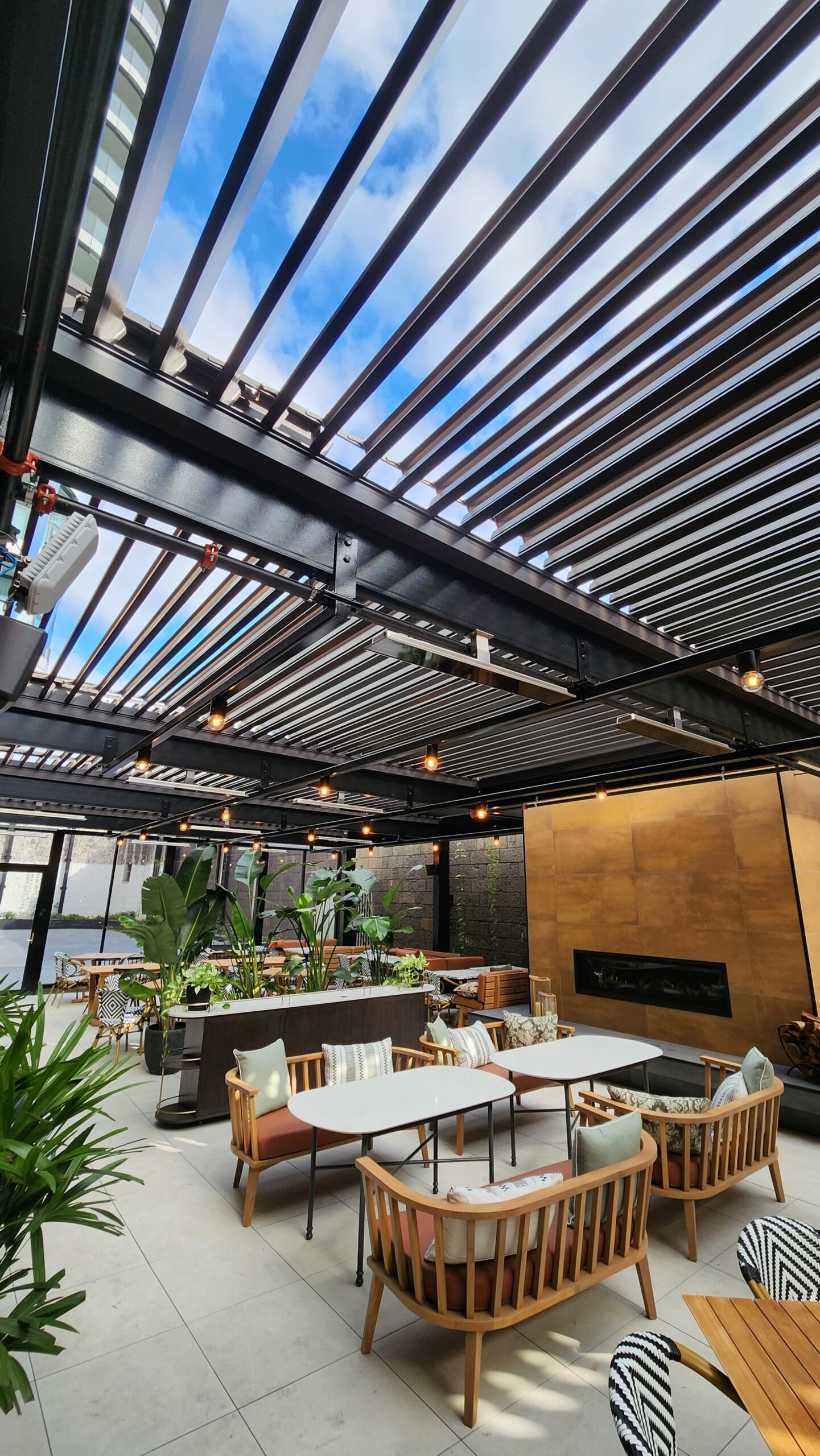 A louvre roof is a set of horizontal parallel blades fitted into an overhead frame, void or bulkhead. With a touch of a button, the louvre blades tilt or retract, depending on the system, to let in the desired amount of air and light whilst blocking UV rays, rain, wind and other unwanted elements.