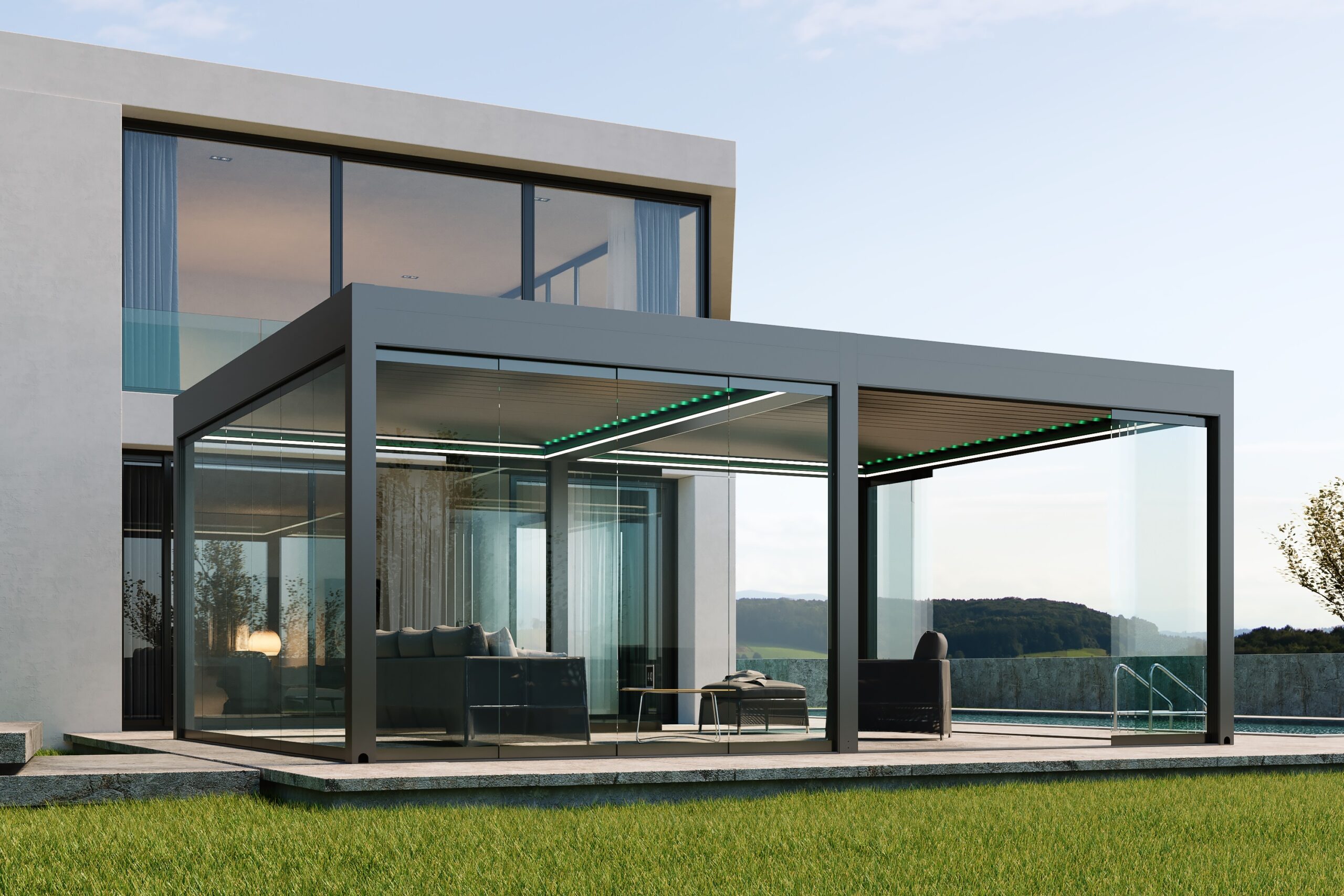 - Custom-made and certified: designed, engineered and cut to the specific sizing required for your space. Option to upgrade your system with added extras including LED dimmer lighting, motorised blinds, heating, rain sensors and sound system.
